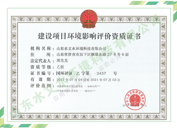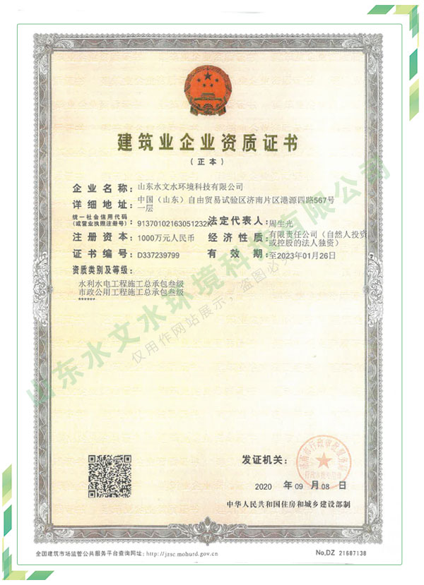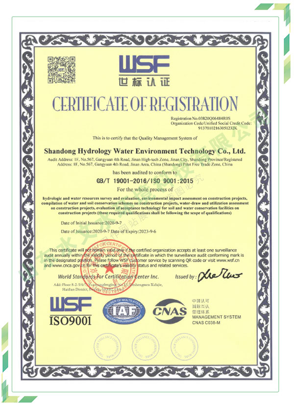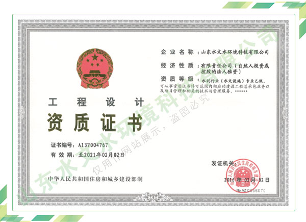 公司擁有水利工程設計、水土保持、水文水資源調(diào)查評價、水資源論證、建設項目環(huán)境影響評價、市政公用工程施工總承包、水利水電工程施工總承包、電子與智能化工程專業(yè)承包等資質(zhì),2017年通過質(zhì)量管理體系、環(huán)境管理體系、職業(yè)健康安全管理體系認證;2020年被評為國家級高新技術企業(yè),同年被中國水利企業(yè)協(xié)會推薦為第一批“合同節(jié)水服務企業(yè)”;2021年被山東省、濟南市評為 “專精特新”中小企業(yè)。業(yè)務范圍涉及水利工程設計;節(jié)水設計、改造、水平衡測試;山洪災害調(diào)查;城市水資源調(diào)查評價;建設項目水土保持方案編制、監(jiān)測、驗收、水土保持規(guī)劃;水安全保障規(guī)劃、建設項目水資源論證、規(guī)劃水資源論證;建設項目環(huán)境影響評價;入河排污口論證;防洪影響評價;市政公用工程施工、水利水電工程施工、電子與智能化工程施工等。